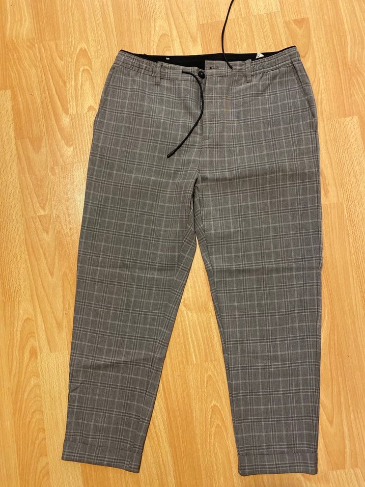 Gri kareli desende, kemerli, regular fit erkek pantolon. Sentetik kumaştan, günlük kullanım için uygun rahat bir sokak stili sunar.