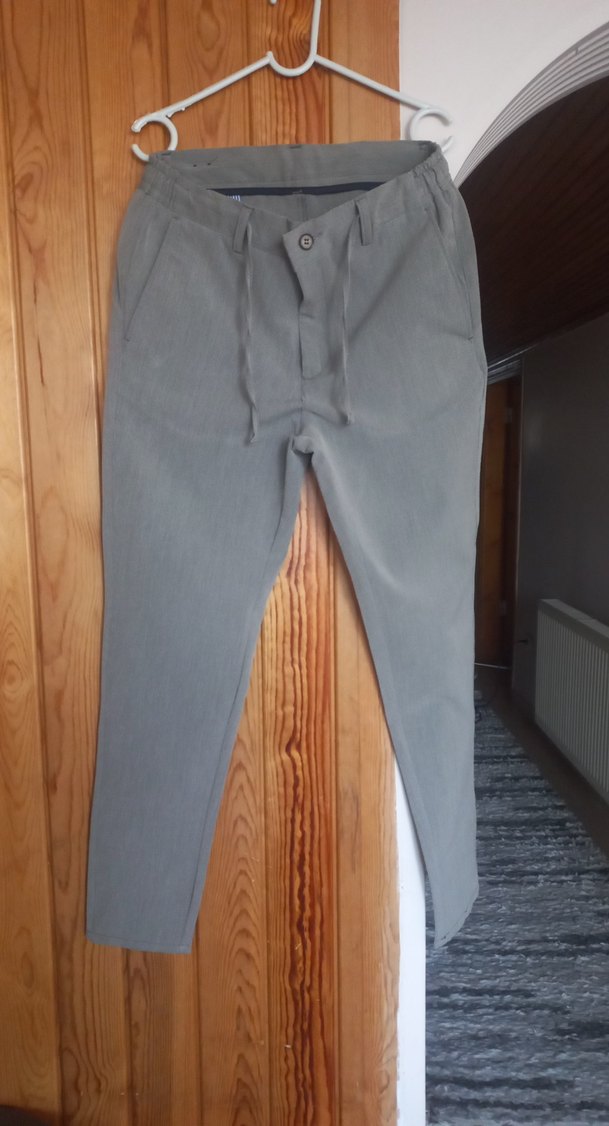 Gri renkte, kemerli ve regular fit kesime sahip erkek pantolonu. Sentetik kumaştan, normal boyda ve desensiz, gündelik athleisure stiline uygun.