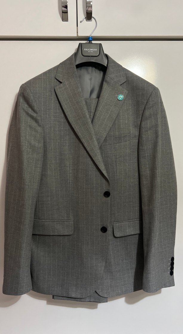 Gri renkte, düğmeli, regular fit ve normal boyda erkek takım elbisesi. Uzun kollu ve klasik şık tarzda, iş ortamına uygundur. Takım çok az kullanıldı. Çok çok iyi durumdadır.