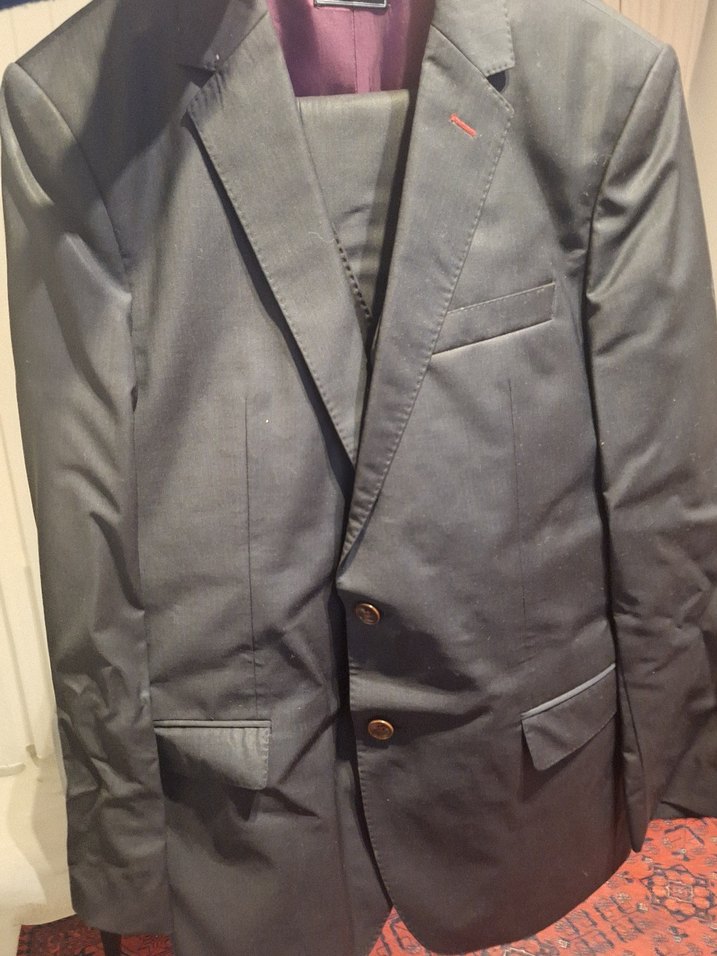 Gri renk, düğmeli ve regular fit erkek takım elbise, keskin yaka ve uzun kollu. Ofis ve sokak stili için uygundur. ️ sorunsuz bir kere giyildi ds damat marka