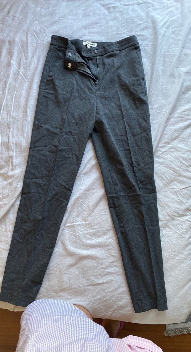 Gri renkte, düğmeli, regular fit kesim kadın denim kumaş pantolon. Midi boyda, desensiz ve iş ortamına uygun.