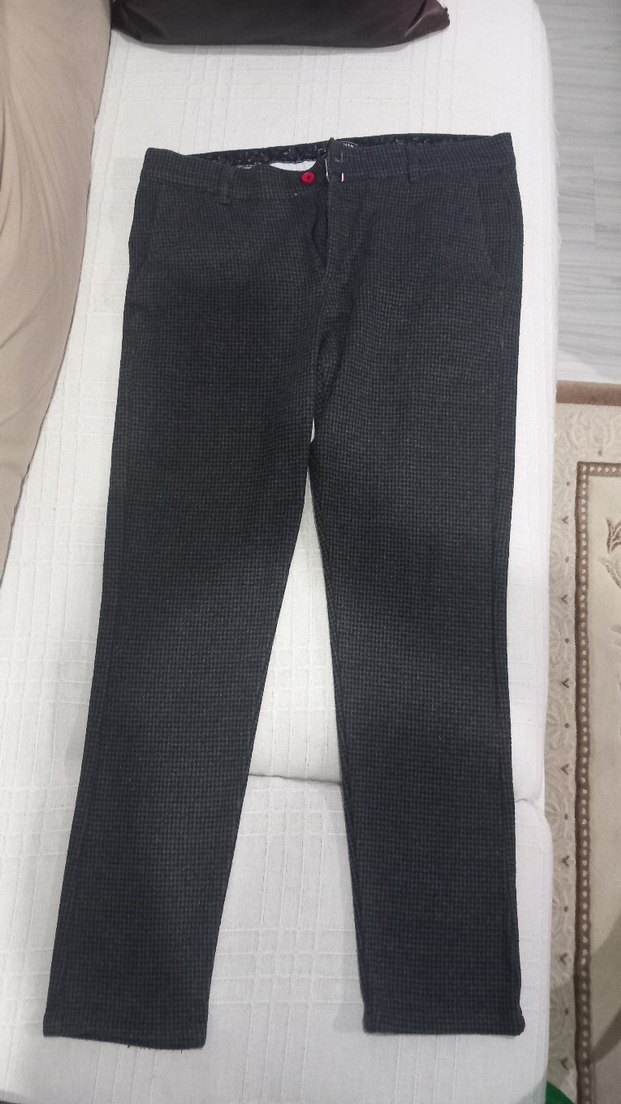 Denim kumaştan gri, regular fit, kemerli kadın pantolonu. Sokak stili, normal boy ve kaz ayak desenli tasarımıyla günlük kullanım için uygundur.