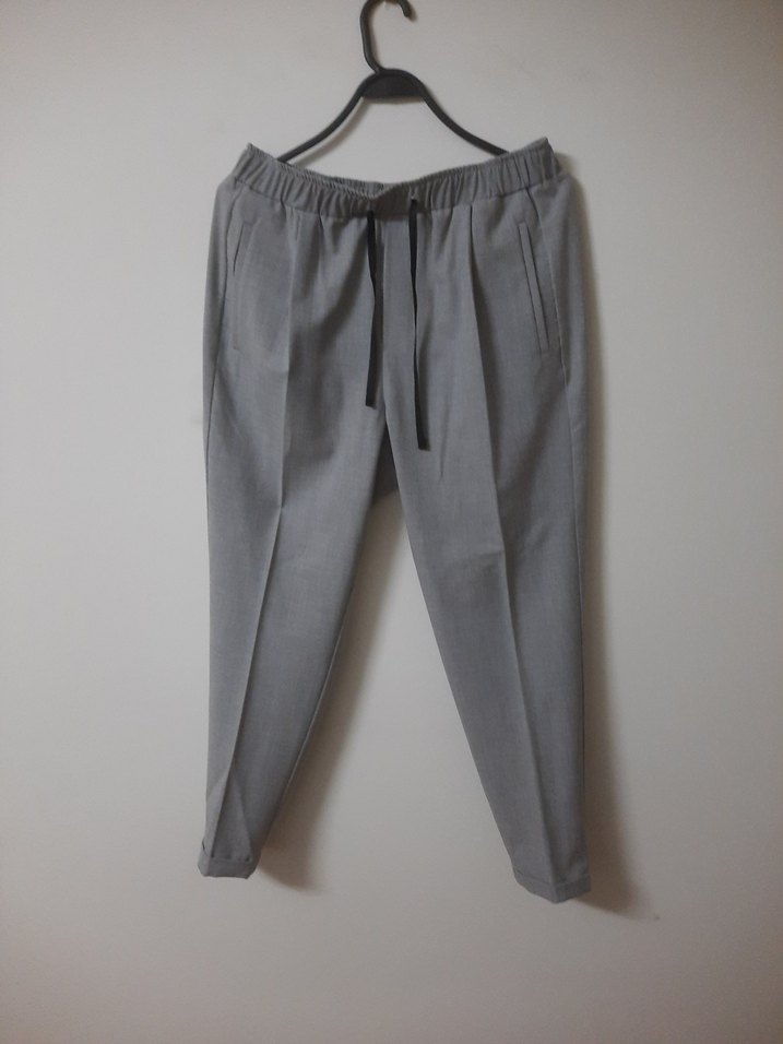 Gri renk, regular fit kesim keten kumaştaBeli lastikli kadın pantolon. Günlük rahat kullanıma uygun midi boy ve lastikli bel detayına sahiptir.