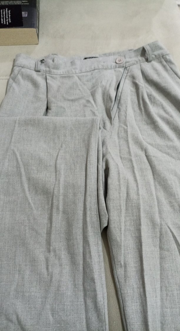 Gri keten pantolon, regular fit, pile detaylı ve midi boyda, minimalist ofis stiline uygun.fotografta pek belli olmayan lekeler var ama çıkabilecek durumda bedeni olmadığı için satıyorum.