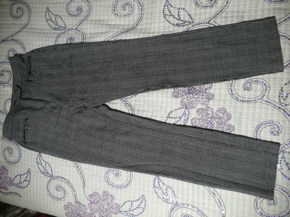 Gri bağlama desenli, pamuklu kumaştan yapılmış, regular fit ve midi boy kadın pantolon. 36 beden sokak ve iş stili için uygundur.
