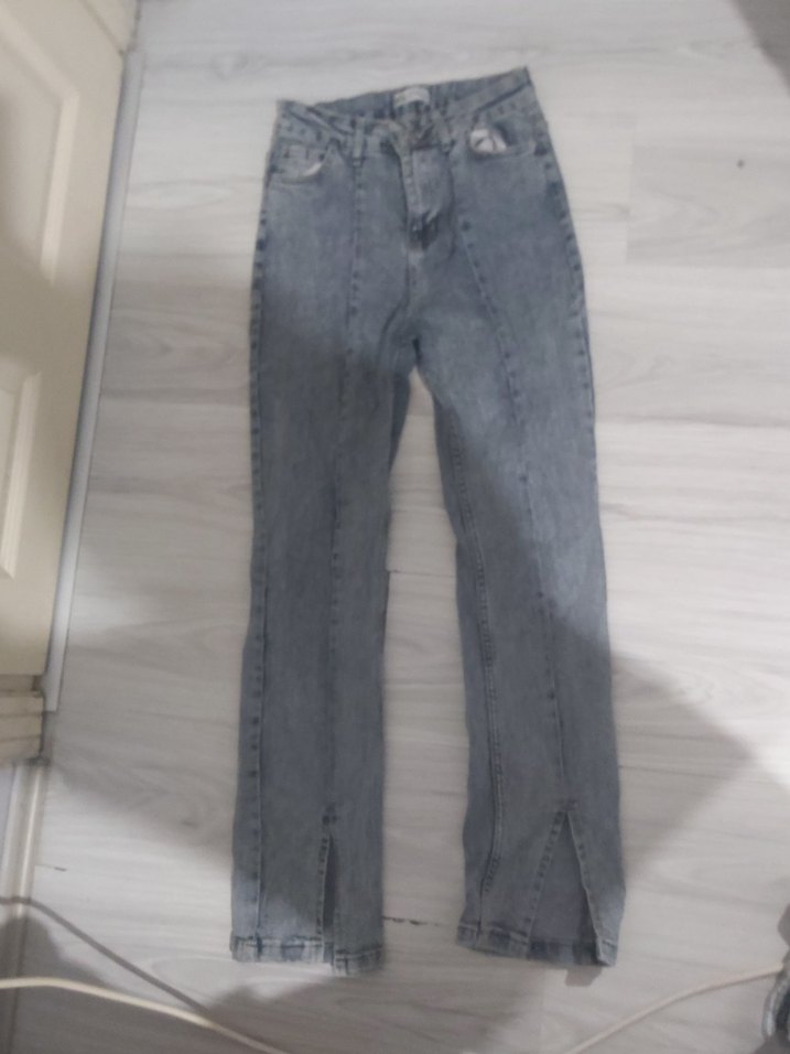 Gri renkli, regular fit ve midi boy kot pantolon, ön kısmında küçük yırtmaçlarla günlük ve rahat sokak stili sunar.