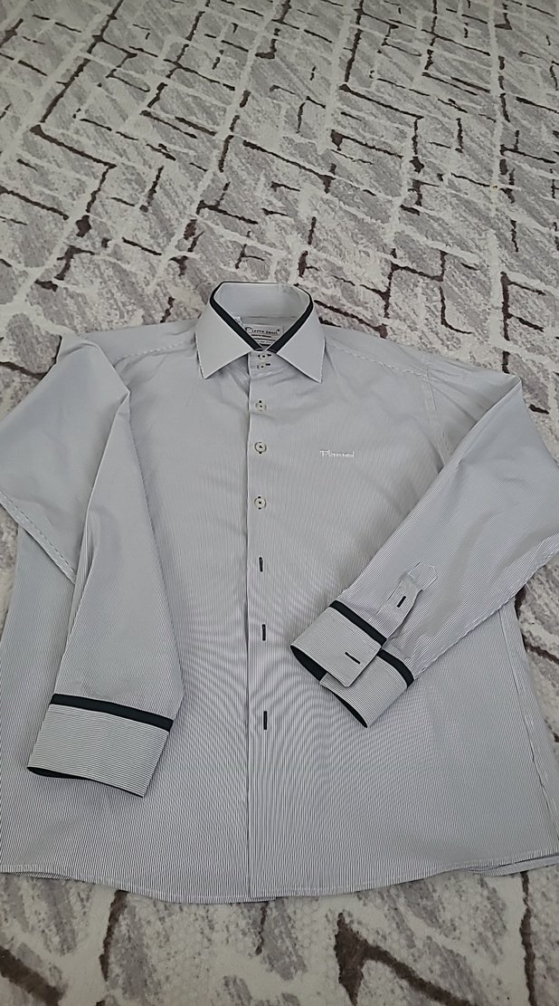 Gri renkte, regular fit kesime sahip erkek gömlek. Düğmeli, yakalı ve uzun kollu, manşet ve yaka detaylarında siyah şerit bulunur. Ofis ve günlük kullanıma uygun sentetik kumaş.
