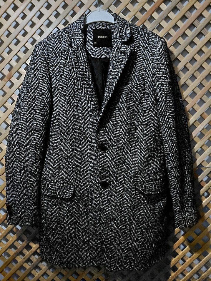 Gri renkli, düğmeli ve regular fit yün erkek ceket. Notch yaka ve uzun kolludur, midi boyda ve desensizdir. İş ve günlük tarzlar için uygundur.