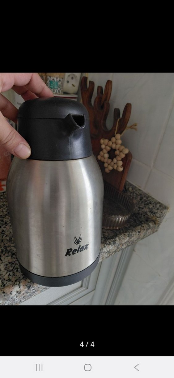 Gri renkli Relan marka, paslanmaz çelik gövdeli ve siyah kapaklı termoslu çaydanlık. ☕