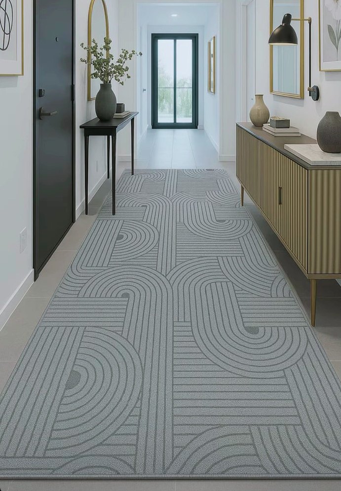 Bu gri halı, kıvrımlı ve çizgisel soyut desenlere sahip olup çağdaş bir stile uygundur. Mekâna modern ve sade bir dokunuş katar.