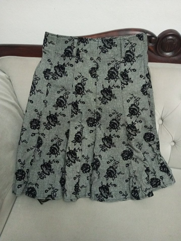Gri renkte, sentetik kumaştan yapılmış, bol kesim ve fırfır detaylı kız eteği. Gotik tarzda, hafif çiçek desenli.