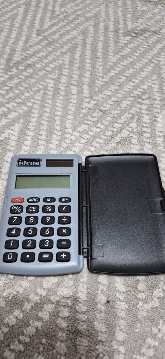 Düz gri renkte, desen içermeyen hesap makinesi. İş ortamına uygun sade tasarım. az kullanılmış kullanılabilir durumda küçük boy hesap makinesi