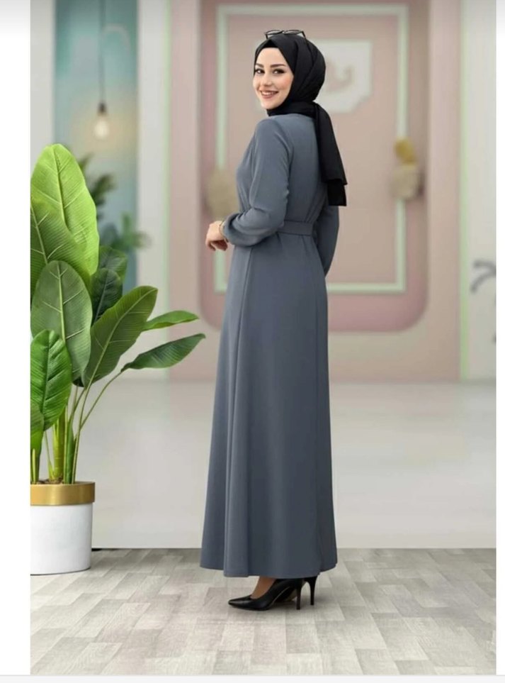 Gri renk kadın kemerli uzun elbise