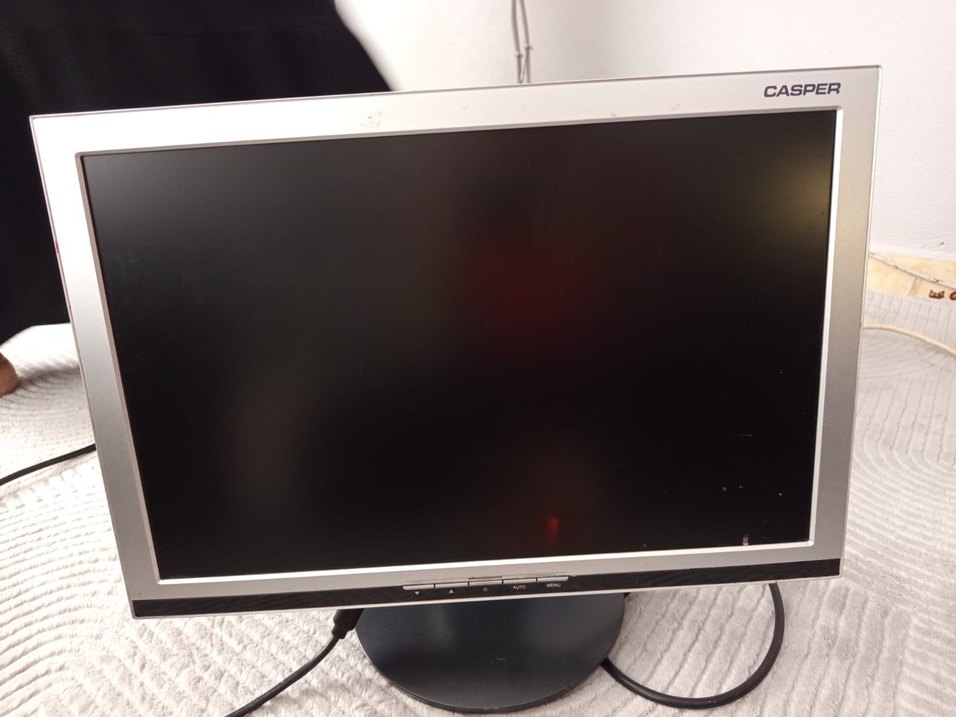 Gri renkte, yuvarlak siyah tabanlı ve ekran altında kontrol düğmeleri bulunan bilgisayar monitörü. Net ekran çerçevesine sahiptir. ️