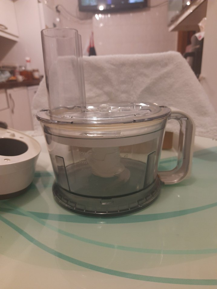 Gri renkte, şeffaf kapaklı ve besleme hazneli blender kabı. Kolay kullanım için kulplu, karıştırma ve doğrama için uygundur. motor kapağı yoktur yedek parça olarak değerlendirilir markasını bilmiyorum sadece tefal diye hatırlıyorum emin değilim