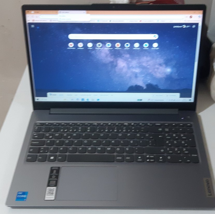 Gri renkli dizüstü bilgisayar, tam klavye ve web tarayıcısı açık büyük ekran ile. Lenovo ideapad 3 1 tb Hard disk 16 GB Ram 12.nesil i5 1 senelik garantisi var. Temiz bilgisayar. Sadece kapağında küçük bir çizik var.