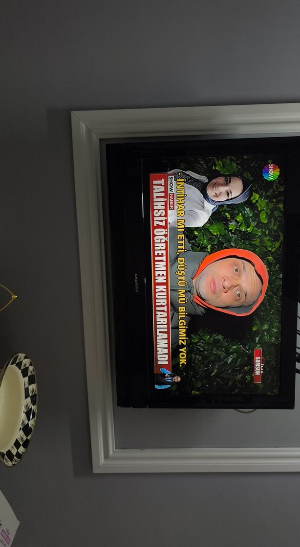 Gri renkte, duvara monte edilmiş monitör. Ekranda Türkçe haber yayını ve iki kişi görünüyor. ️