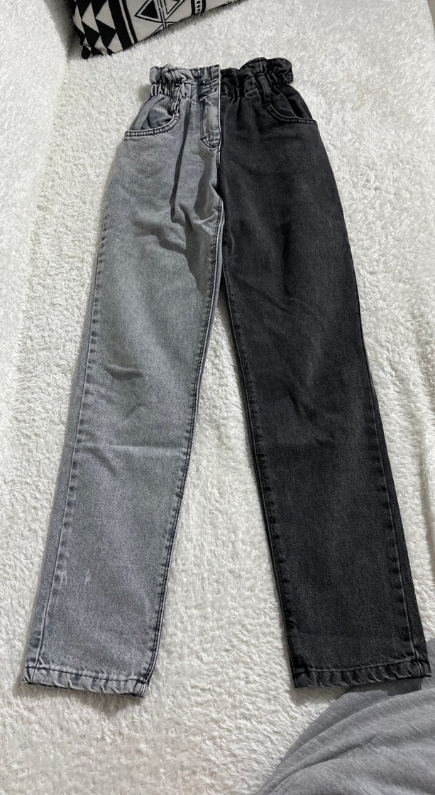 Gri tonlarında iki renkli, bol kesim kot pantolon. Kemerli bel ve midi boy ile günlük sokak stili için uygundur.