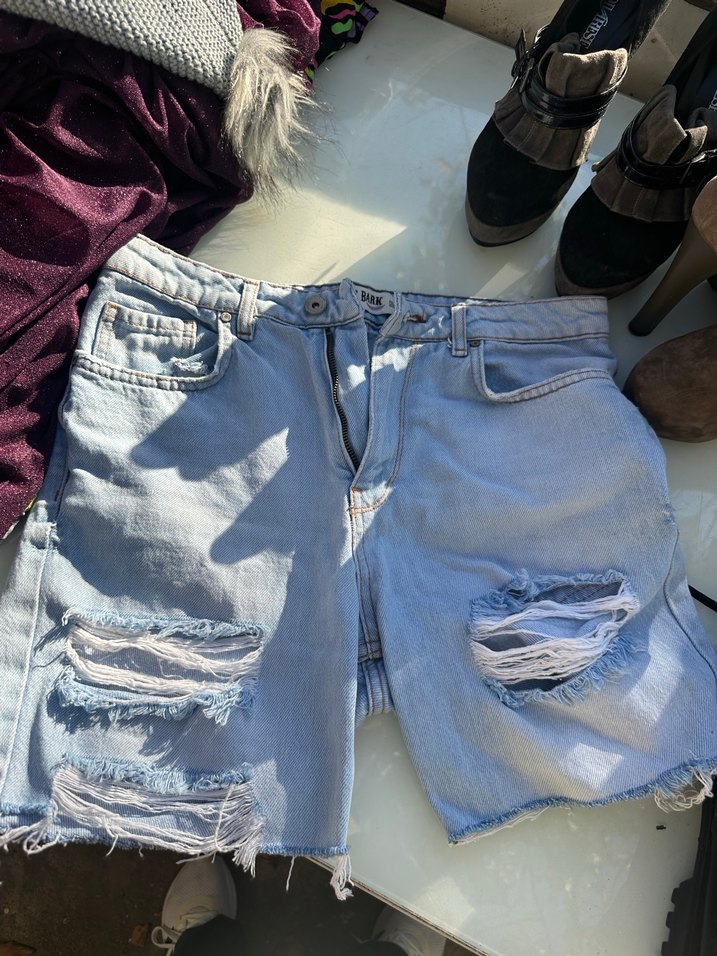 Gri tonlarında, gevşek kesim ve mini uzunlukta kadın kot şort. Yırtık detaylar ve tokalı tasarım ile sokak stiline uygun.
