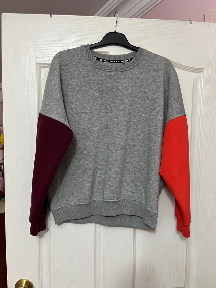 Gri gövdesi ve bordo ile kırmızı kolları olan, yuvarlak yakalı ve uzun kollu, rahat kesimli kadın sweatshirtü. Yumuşak ve sıcak kumaştan günlük kullanım için uygundur.