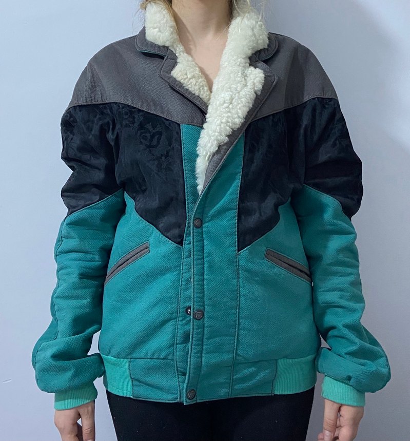 Gri, siyah ve turkuaz renkli desenli, uzun kollu, notched lapel yakalı, kürklü detaylı, midi boy, bol kesim kadın kışlık ceket.