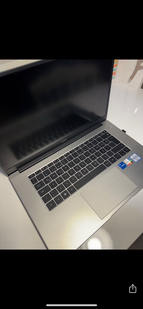 Gri renkli laptop, tam klavye ve geniş dokunmatik yüzey ile Intel işlemci etiketlerine sahip. Temiz az kullanıldı kutusuyla gelecektir. Şarj kablosu var.Huawei matebook D15 modelli 512gb ssd alanı vardır. 8gb ram İ5 11. Nesil işlemci temizdir.