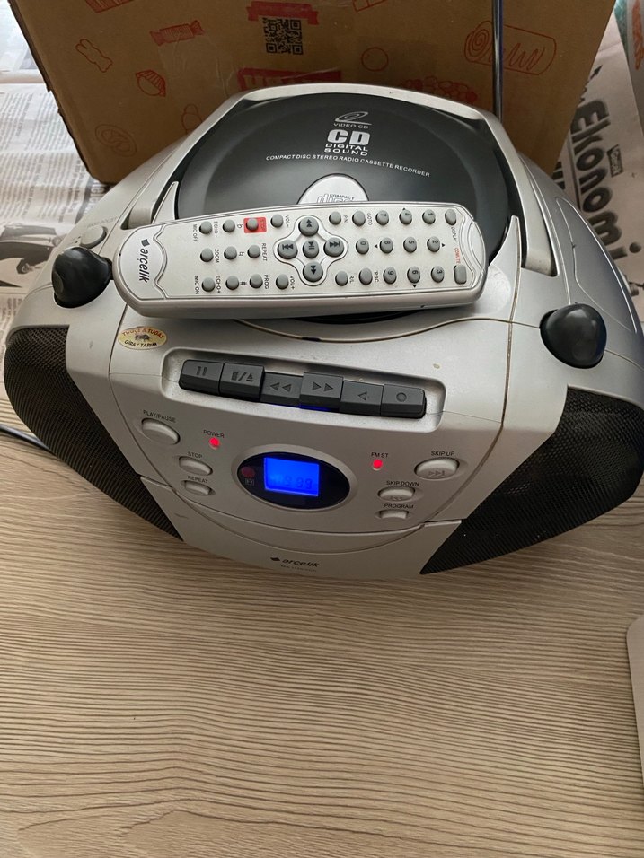 CD çalar ve uzaktan kumanda özellikli gri müzik sistemi, oynatma düğmeleri ve dijital ekran bulunur.
