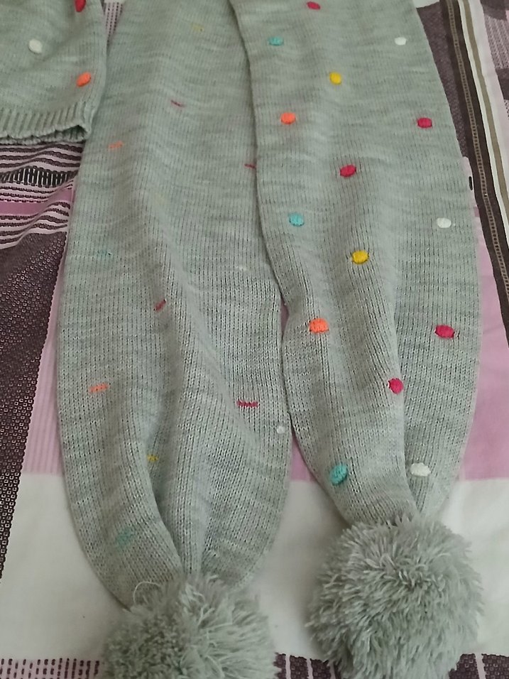 Gri renkli örme çocuk bere ve atkı seti, renkli nakışlı noktalar ve yumuşak ponponlarla bohem tarzı sunar.