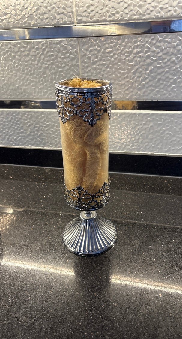 Gri renkte, zarif süslemelere sahip ve sağlam tabanlı mumluk. ️