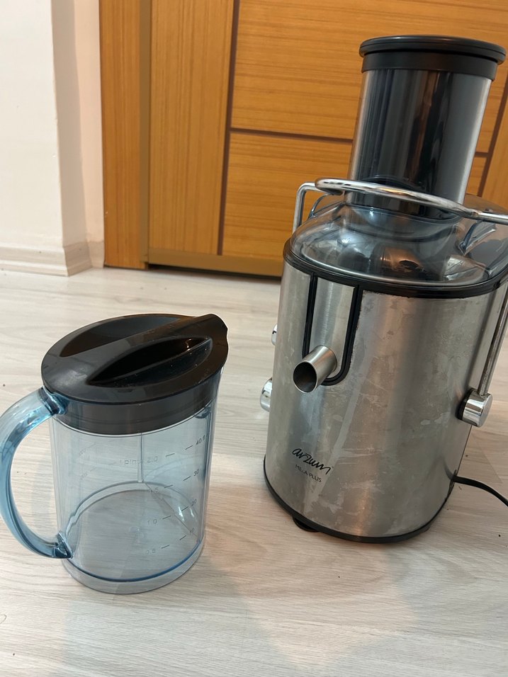 Gri renkte paslanmaz çelikten yapılmış katı meyve sıkacağı, kapağı olan çıkarılabilir sürahisi ve geniş besleme deliği ile kolay kullanım sağlar. Güvenli kilit kolu mevcuttur. Dolap üstünde beklettiğim için etrafı silinecek duruma geldi silindiğinde hiç bir iz kalmıyor temizdir