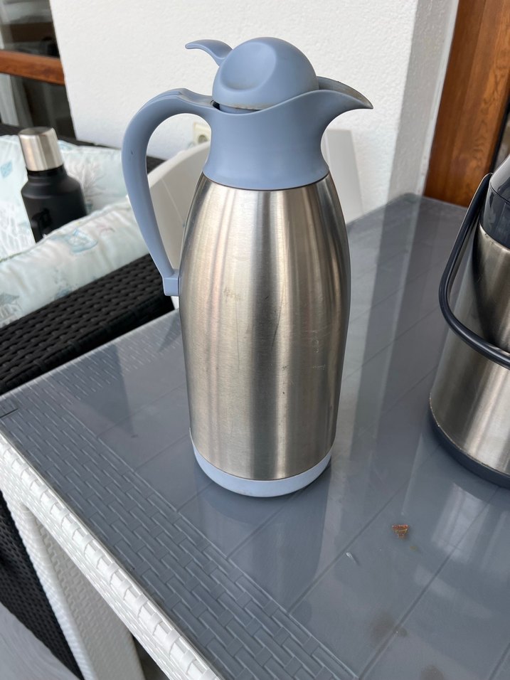 Gri renkli çaydanlık, paslanmaz çelik gövde ve kullanışlı kulpa sahiptir. İçecekleri uzun süre sıcak tutar. ☕ yeni gibi ikinci el