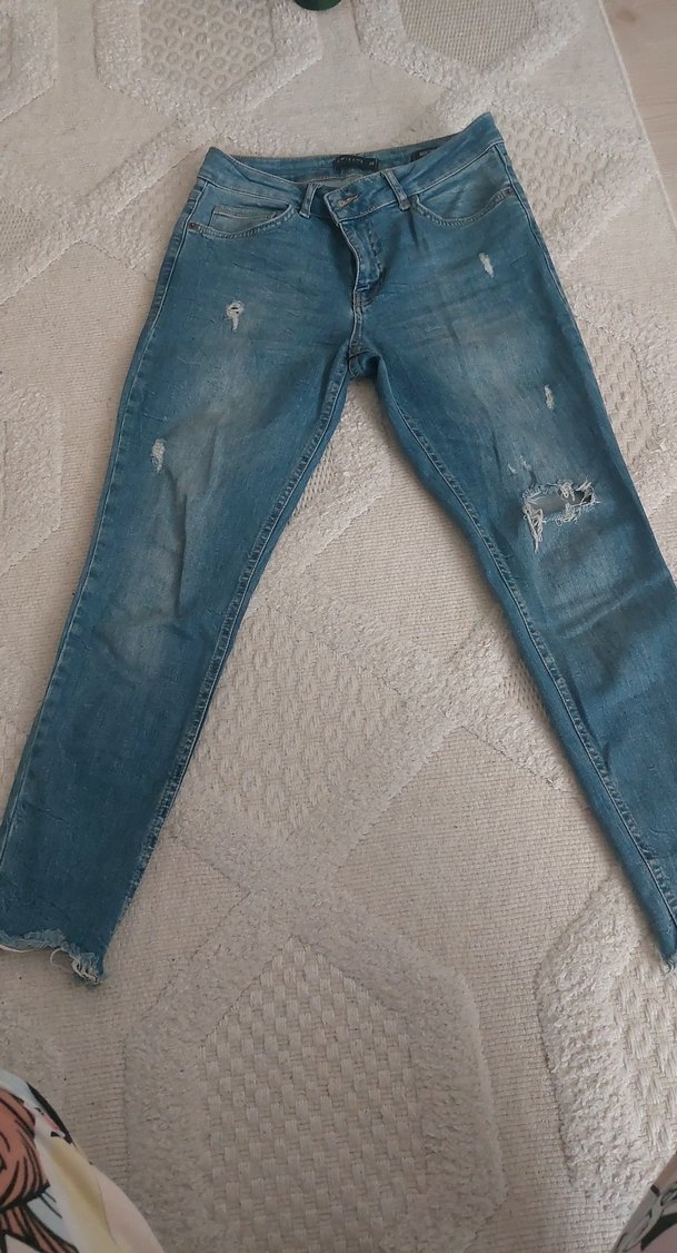 Gri renkli, rahat kesim kadın jean pantolon. Tokalı detayı ve yırtık görünümlü sokak stili, günlük kullanıma uygun. ürün boy 90cm