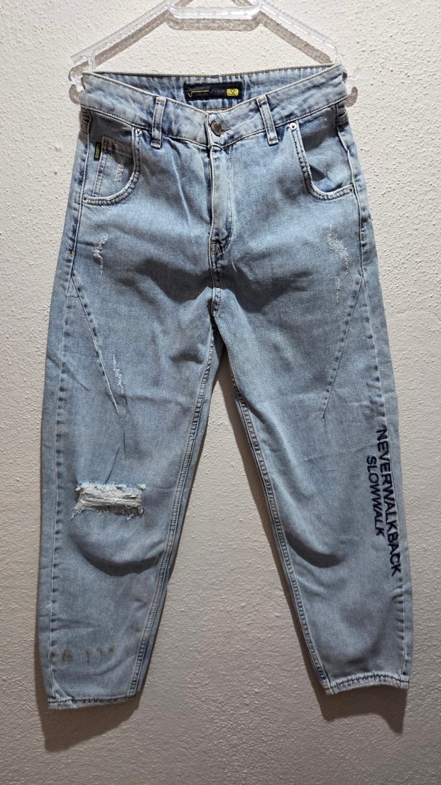 Parçasında lekesi var, fotoğraflarda görülüyor Gri renkli, salaş kesim kadın kot pantolon, normal midi boyda ve hafif yıpratılmış detaylarla günlük sokak stiline uygun. Tek bacakta yazı detayı ile zahmetsiz şıklık sunar.