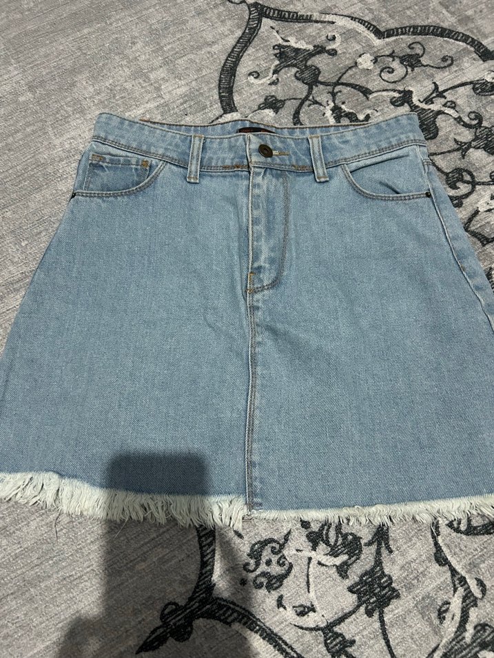 Mavi denim kumaştan, salaş kesime ve püsküllü eteğe sahip bu etek, günlük kullanım için rahat ve şık bir görünüm sunar.