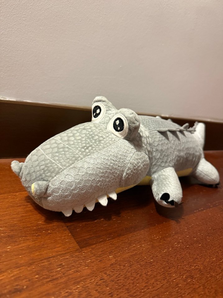 Gri renkte, dokulu kumaştan timsah şeklinde peluş oyuncak, yumuşak ve sarılabilir yapıdadır.