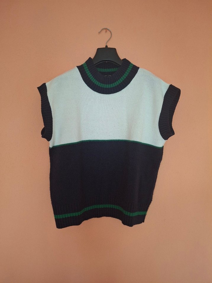 Kısa boy, rahat kesim, bisiklet yaka, çok renkli gri triko kadın süveter. Günlük sokak stiline uygun.