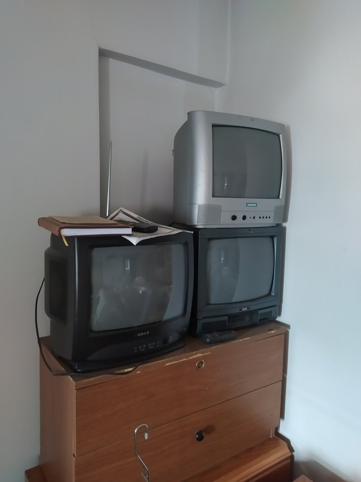 Gri ve siyah renklerde üç eski monitör, köşede ahşap bir çekmecenin üzerinde üst üste duruyor. Eski model kalın tasarıma sahip.