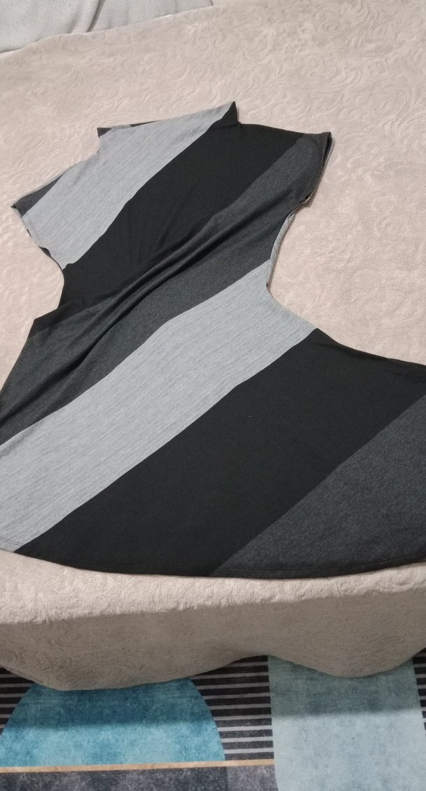 Gri tonlarda, kayık yaka ve kolsuz, vücuda oturan drapeli hamile uzun tunik. Yumuşak sentetik kumaştan, günlük kullanıma uygun.