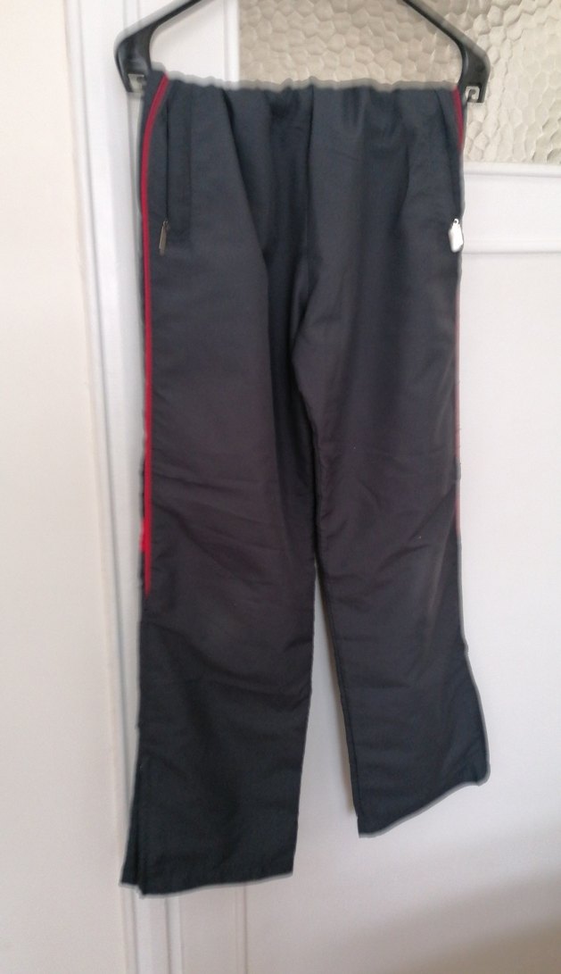 Koyu gri renkte, kırmızı ve siyah detaylı spor tarzı astarlı çok az kullanılmış temiz yeni gibi cepler ve eşofman paçası fermuarlı hayırlı olsun inşallah boy 100 cm paça fermuar kapalı iken 22, 5 cm fermuarı açınca 26 cm oluyor