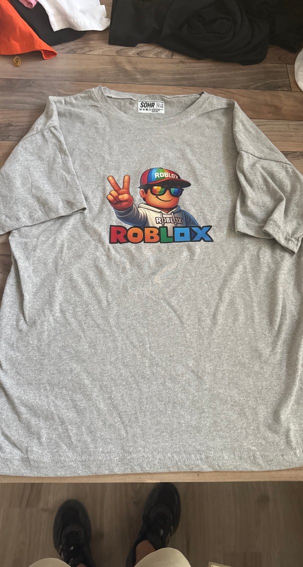 Gri renkli, bol kesim, kısa kollu ve bisiklet yaka erkek tişörtü. Üzerinde renkli Roblox baskısı ve düğmeler bulunur. Yumuşak ve sıcak kumaştan üretilmiştir. Beden yanlış basılmıştır. M bedendir