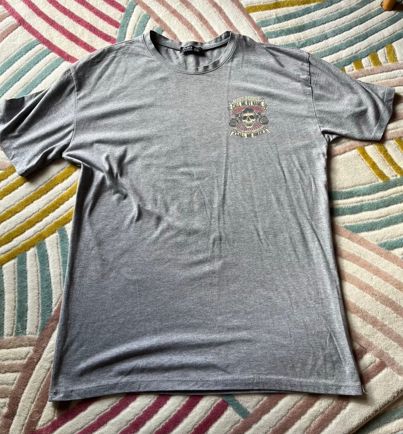 Pamuklu, kısa kollu, bisiklet yaka gri tişört. Rock punk baskılı ve düğmeli, rahat kesim, günlük kullanıma uygun.