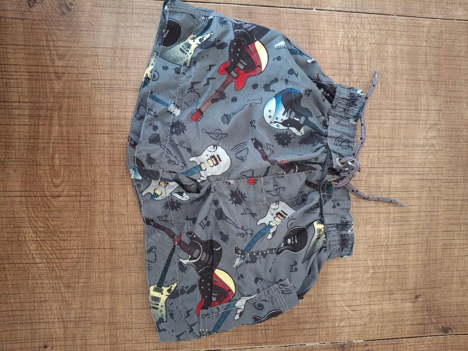 Gri tabanlı, rock punk gitar desenli, bol kesim erkek şort. Sentetik kumaştan olup, düğme detayları ve lastikli bel içerir.