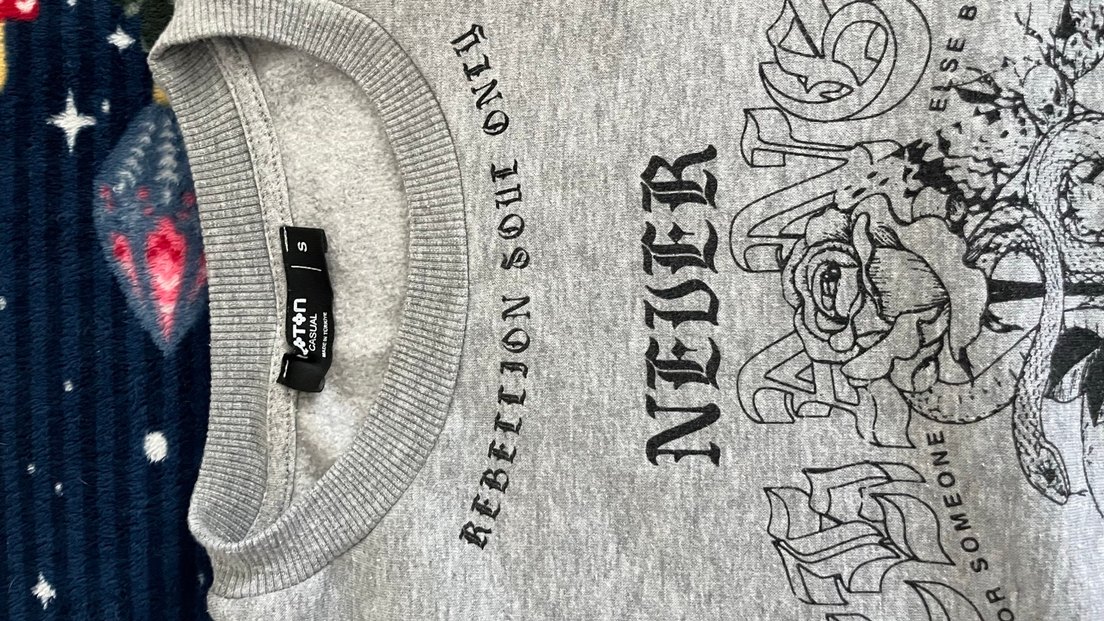 Gri renkte erkek sweatshirt, siyah baskılı yazılarla grunge punk tarzını yansıtıyor. Ribana yakası rahatlık sağlar.