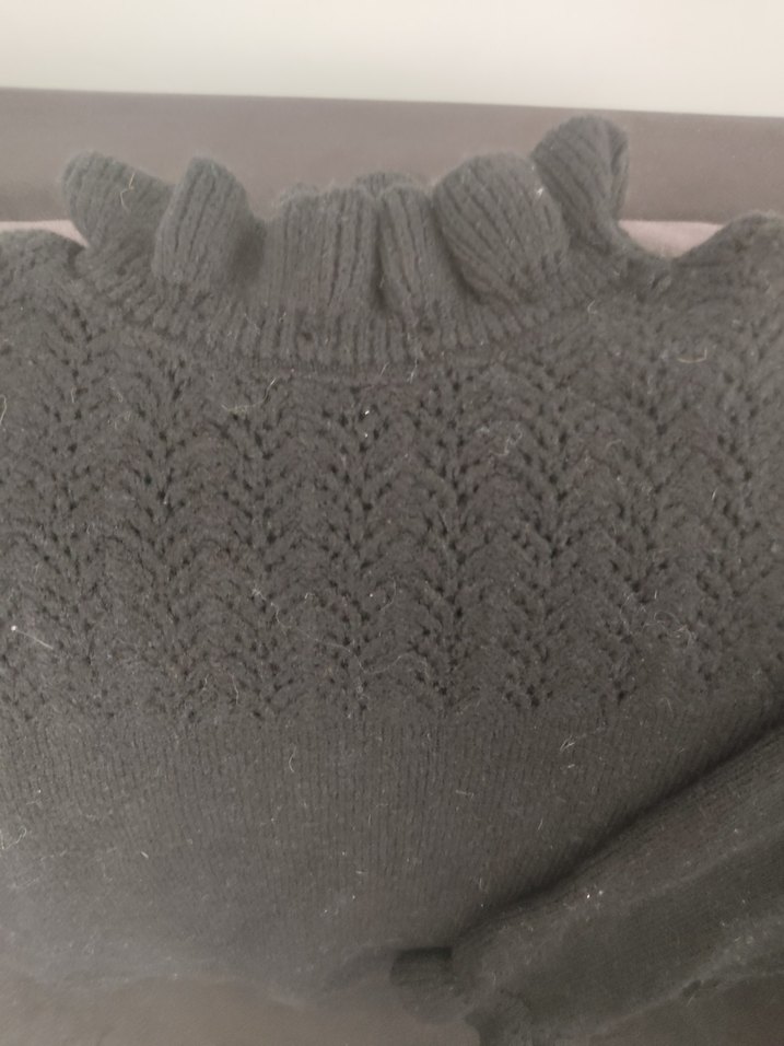 Siyah boğazlı ve fırfırlı detaylara sahip, uzun kollu, vücuda oturan örgü kazak. Rahat ve gotik tarzda, günlük kullanım için uygundur.