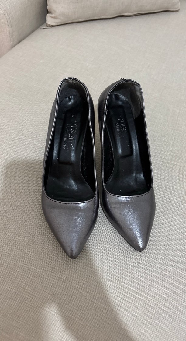 Ofis kullanımı için uygun, rugan görünümlü gri stiletto topuklu ayakkabılar, minimalist ve modern klasik tarzda.
