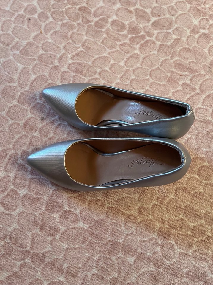 Parlak gri renkli, sivri burunlu ve kauçuk tabanlı kadın stiletto topuklu ayakkabı, modern klasik ofis stiline uygun. Bir kere düğünde giydim. 35 numaradır. Rahat kullanışlı şık ayakkabıdır