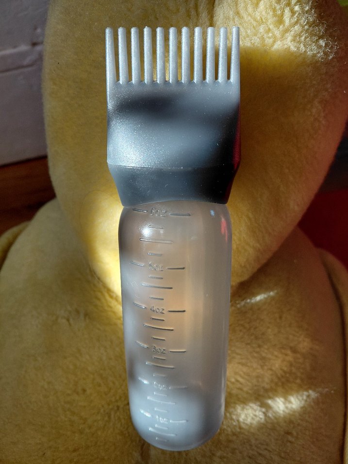 Bej renkte, üzeri gri tarak şeklinde kapaklı, üzerinde ölçü işaretleri bulunan bakim şişesi.