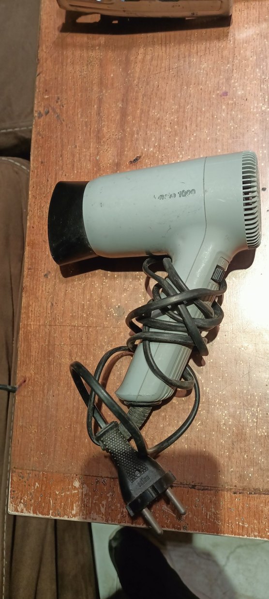 Kompakt tasarımlı, odaklı hava akışı sağlayan başlıklı gri saç kurutma makinesi. Standart güç kablosu ve basit açma-kapama düğmesi bulunur. ♀️