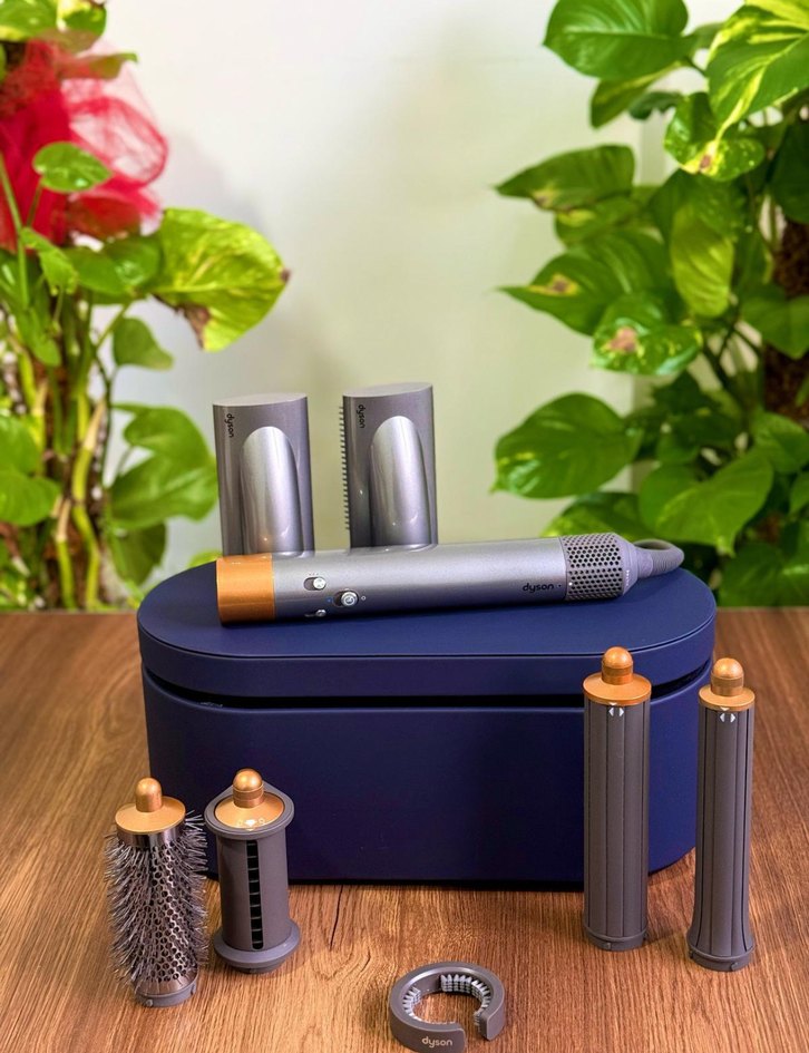 Çeşitli başlıklarıyla gri saç şekillendirici seti, farklı saç stilleri için fırçalar ve taraklar içerir. Saklama kutusuyla birlikte.