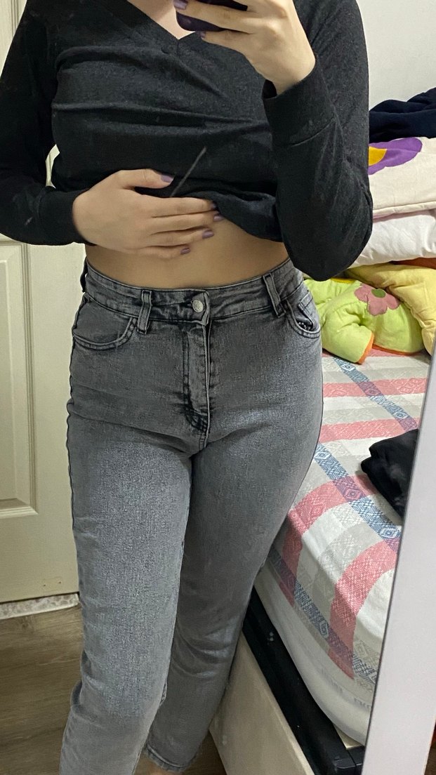 Düğmeli, gri renkte, normal boyda, dar kesim kadın jean pantolon. Günlük kullanıma uygun 50-62kg uygundur